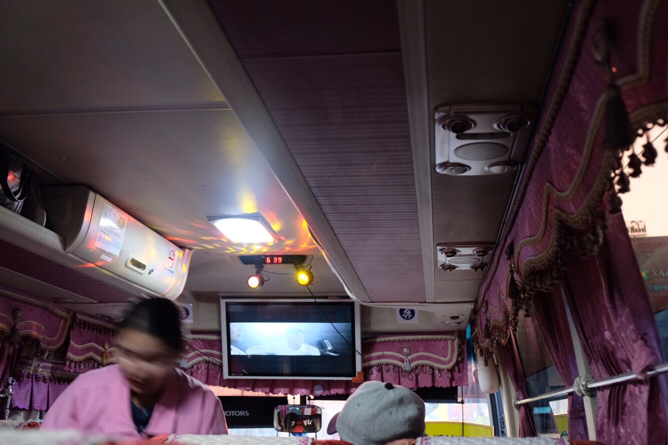 Mon bus est à 19h à la gare routière (qui n’a de gare que le nom) de Dragon, à l’ouest d’Oulan Bator. Je décide d’y aller plus tôt afin d’acheter quelques provisions pour le trajet et le séjour qui m’attendent. Je suis la seule étrangère au milieu de la foule, la seule étrangère au milieu du bus, et je crois que l’on me regarde comme une apparition surréaliste. Le chauffeur me sourit et nous tentons de communiquer avec quelques gestes, en vain. Nous partons dans les temps, il allume la télé, des morceaux et clips de variété mongole apparaissent, qui ne s’arrêteront que quelques heures pendant la nuit et dont le volume sonore reprendra de plus belle vers 6h du matin. Vers 23h, je découvre ainsi la Macarena mongole…
