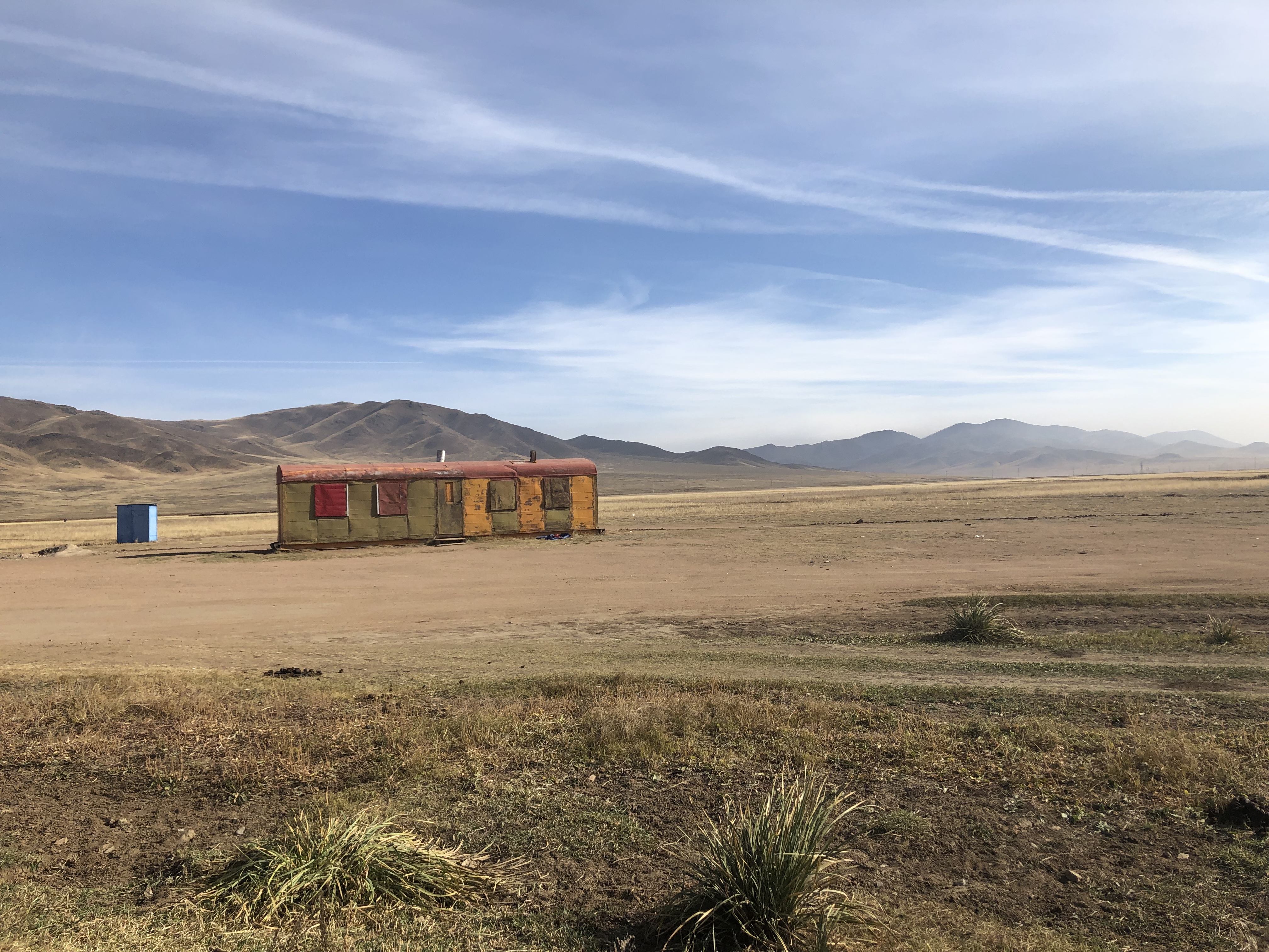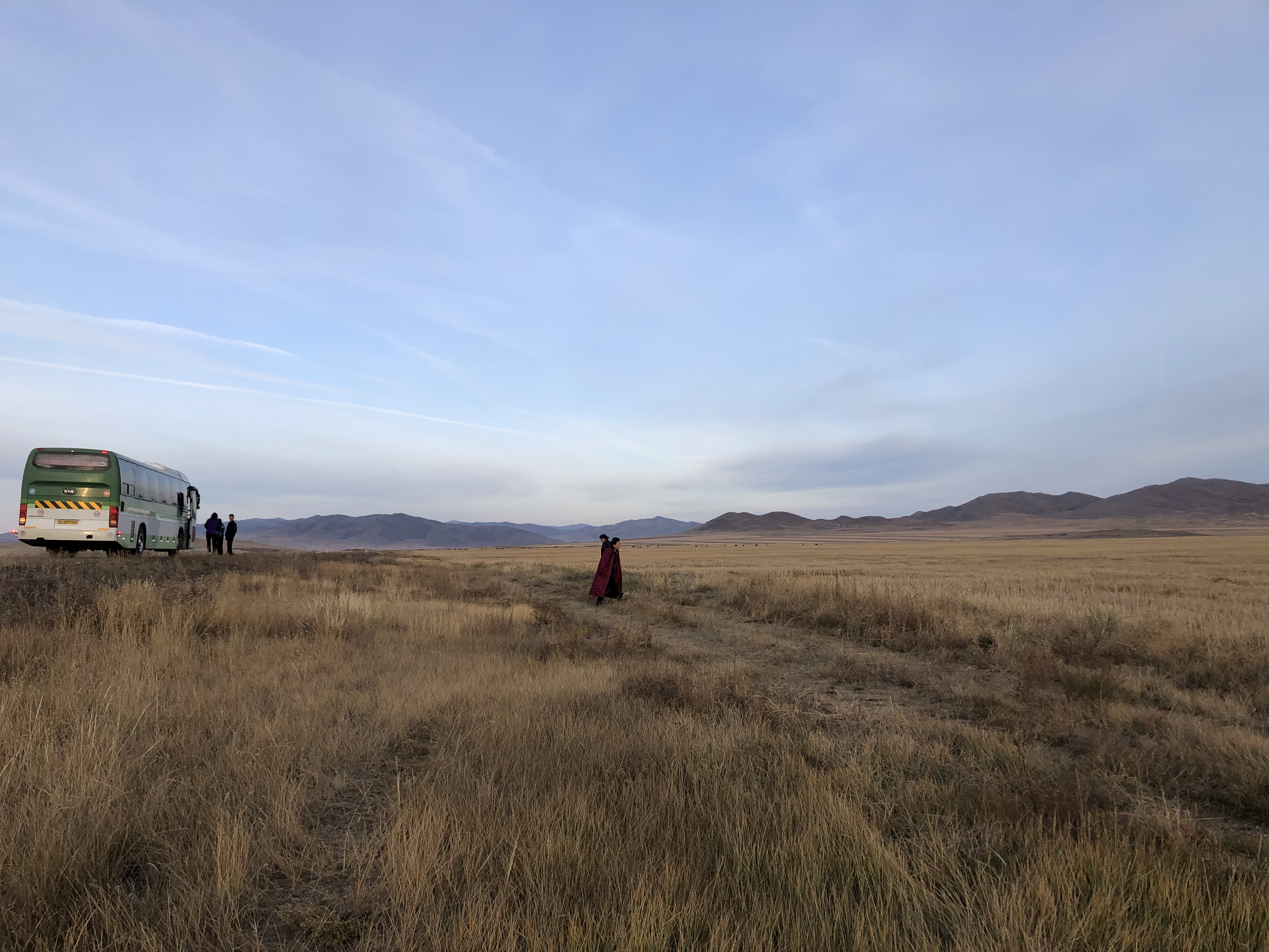 De retour sur une route parfaitement goudronnée aux alentours de 4h, je parviens enfin à m’endormir. Vers 6h30, l’aube est là, j’ouvre pleinement les yeux et découvre l’étendue du paysage, qui baigne dans une lumière rouge sang. La Mongolie telle que l’imaginaire de chacun peut la concevoir se révèle. Nouvel instant de grâce. Je frotte régulièrement la fenêtre de ma main pour y ôter la buée et la condensation qui s’y forment, et tente de m’imprégner au mieux de cette immensité immaculée. Je me rendors, apaisée. Vers 8h il me semble, le bus s’arrête pour une nouvelle pause. Je sors avec entrain pour mieux m’immiscer dans cet environnement. Là, dehors, au milieu de rien d’autre qu’une route rectiligne à perte de vue et d’une palette de couleurs brunes, je respire.