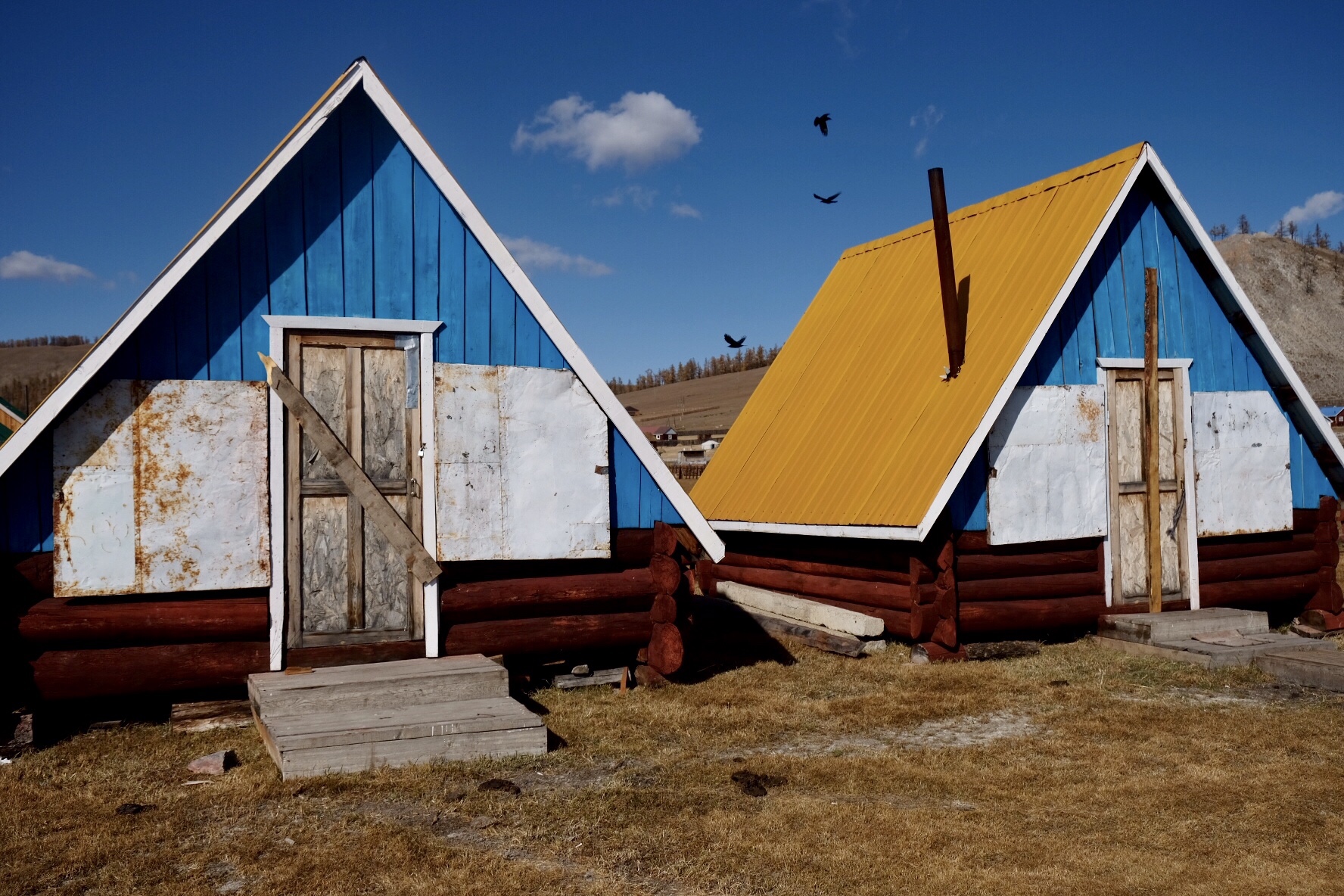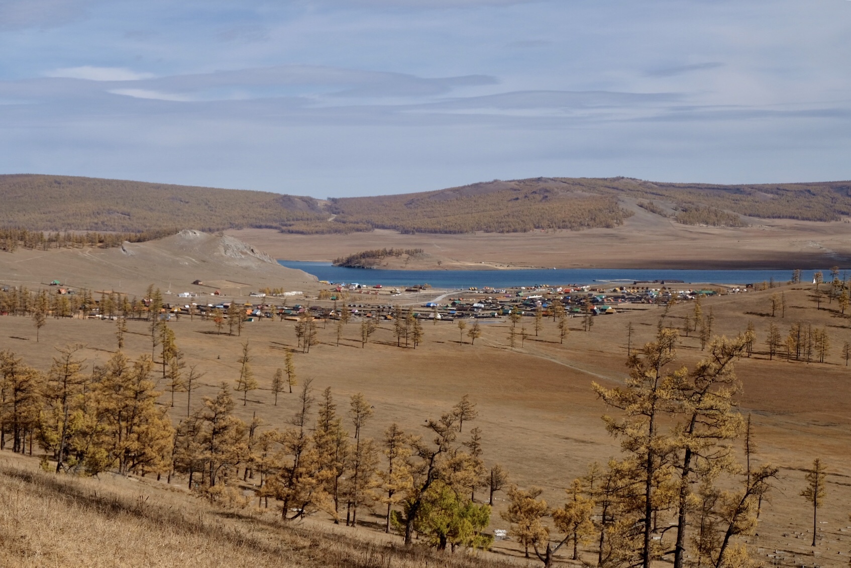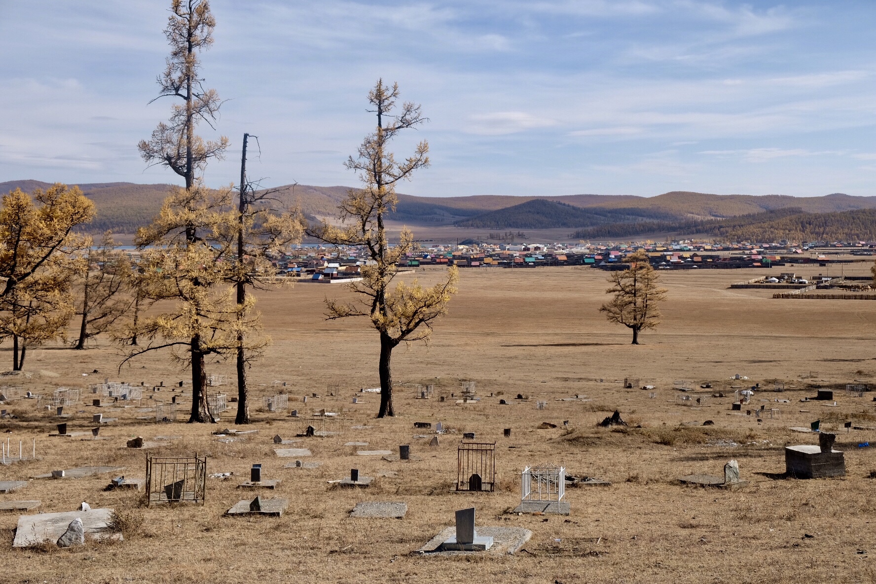 Lorsque je m’installe dans ma yourte le samedi vers 12h30, je suis épuisée mais décide tout de même de partir à la découverte du lieu où je me trouve, attirée par les couleurs automnales et le climat agréable. Il ne fait ni chaud, ni froid, un brin d’air frais tempère mes sensations et m’encourage à marcher vers une hauteur à une heure de la Guest House où je me trouve, d’où un employé me dit que je peux apercevoir le lac. Un tableau digne d’un grand maître s’offre à moi : le cimetière et ses pierres blanches, les arbres et leur habit orangé, le sol recouvert d’un tapis doré, l’eau d’un bleu azur vif, les toits multicolores du village comme autant de touches de peinture sur une toile pointilliste… Des corbeaux tournent dans le ciel sans cesse, ils dansent en duo et le glissement de leurs ailes sur l’air crée une musique inédite qui berce ma contemplation.