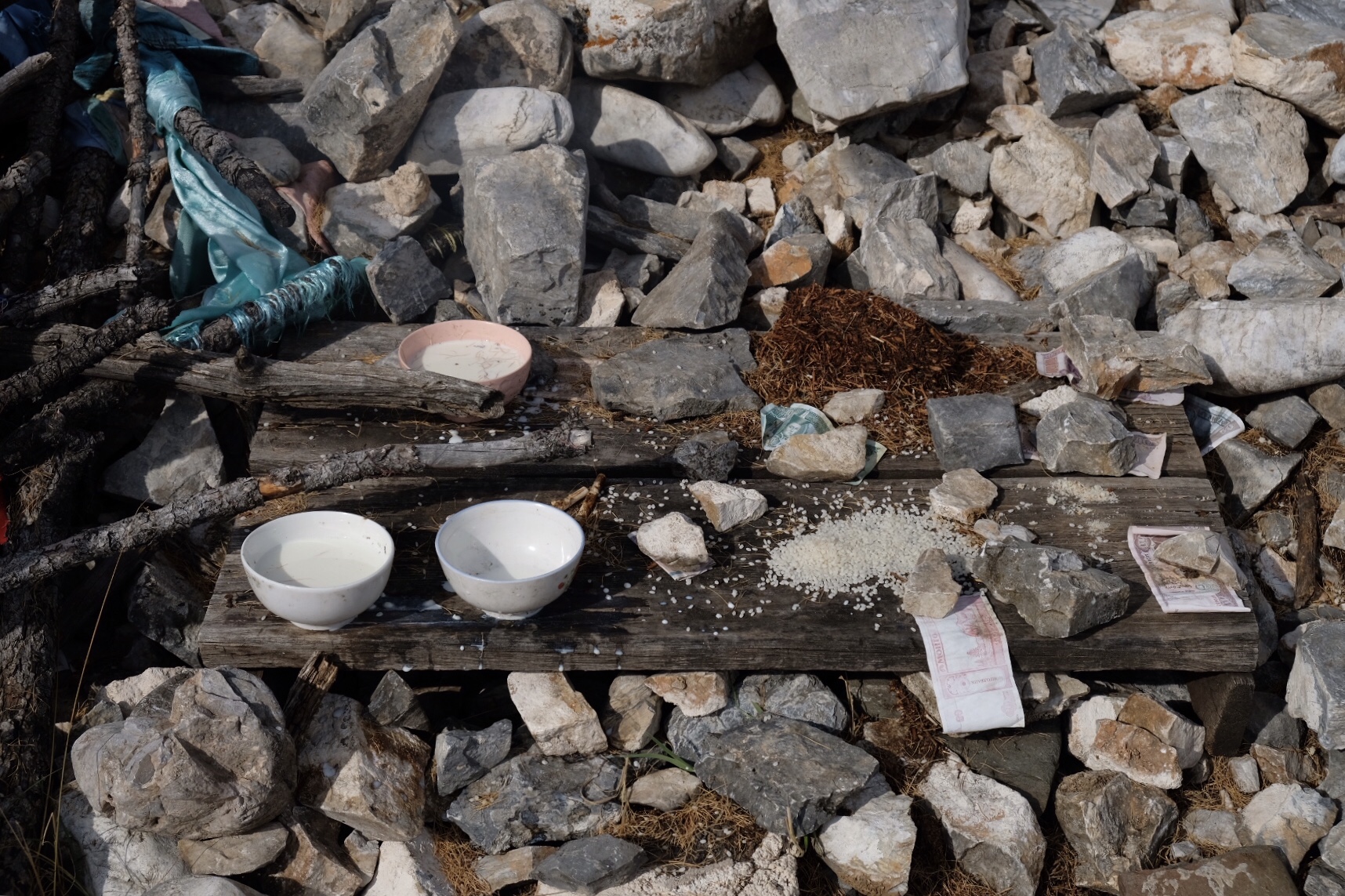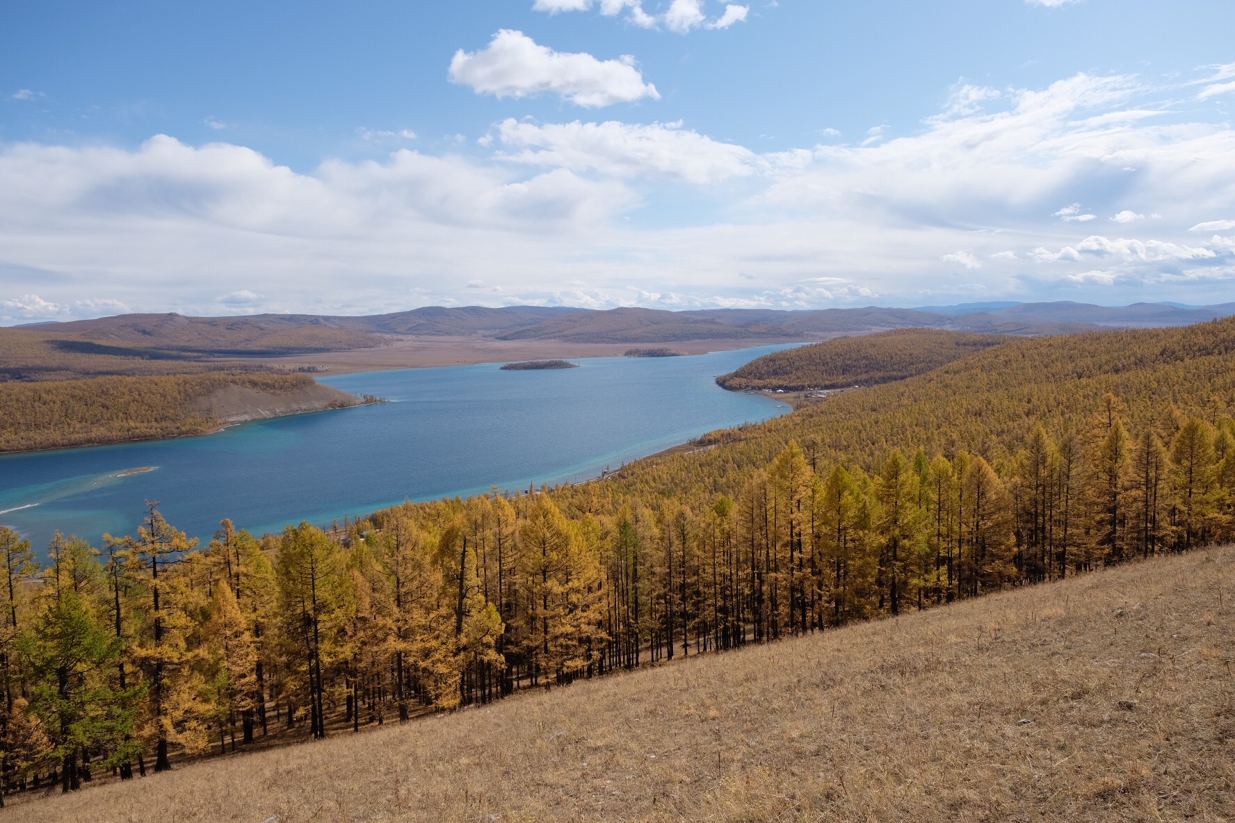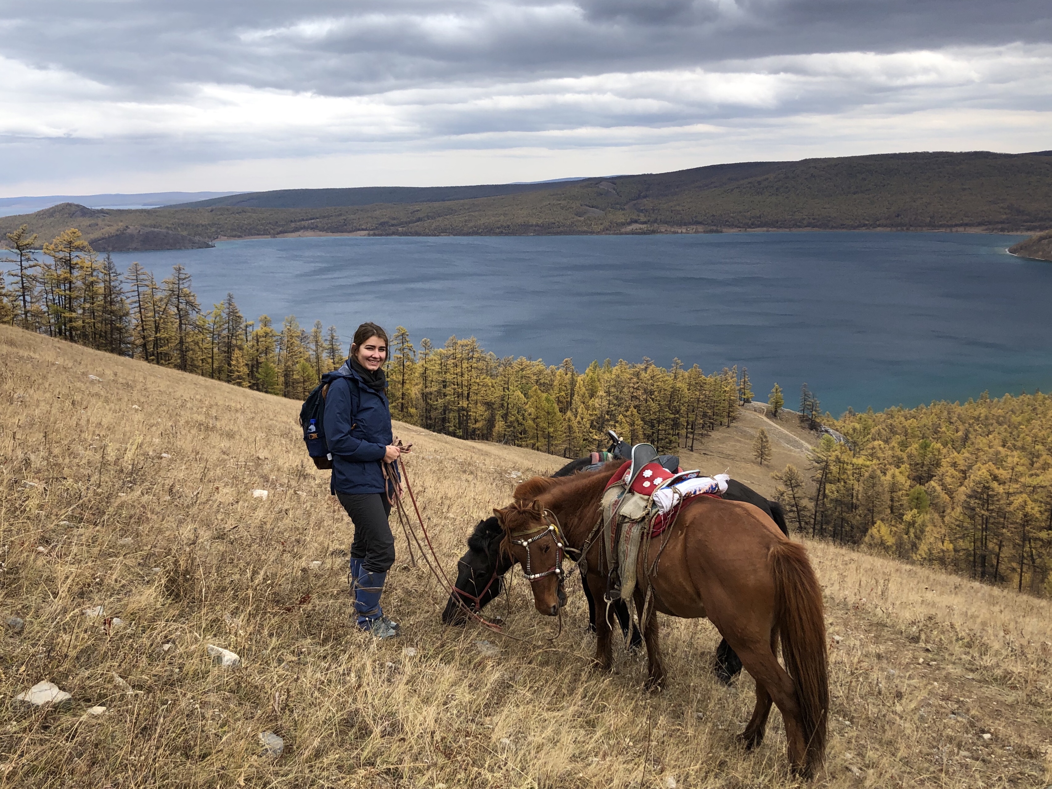 Le lendemain, la beauté de ce lieu se révèle un peu plus à moi quand je marche une vingtaine de kilomètres en compagnie de Susana, espagnole avec qui je partage ma yourte, et Thomas, français rencontré au petit déjeuner. L’un des chiens de la Guest House se joint à nous pour la journée. Nous longeons la rive ouest du lac et gravissons un sommet pour découvrir des Ovoos, structures chamaniques de pierres et de bois où les Mongols viennent déposer des offrandes et attacher des tissus où sont inscrites leurs prières qui peuvent alors flotter dans le vent jusqu’aux Esprits… Nous jouissons d’un point de vue époustouflant sur le lac et la rive opposée.