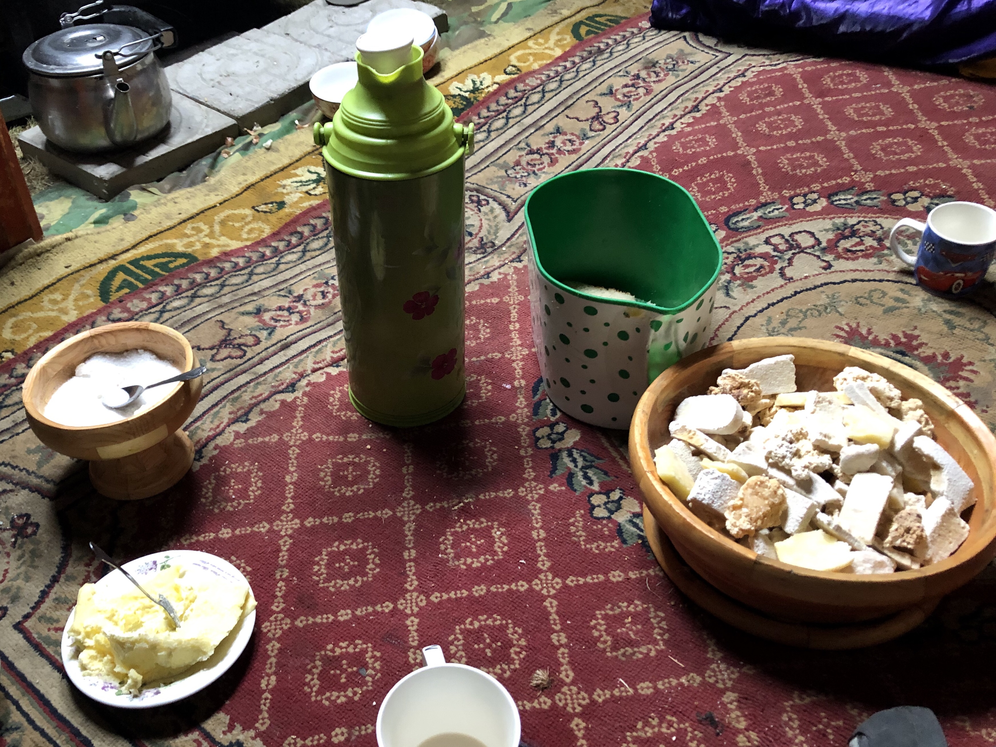 Lorsque nous arrivons, le mardi vers 16 heures, chez la famille qui nous héberge pour la nuit au cours de notre randonnée à cheval, Filip (Hollandais rencontré à Oulan Bator et qui arrive à Hatgal quelques jours après moi) et moi sommes accueillis dans leur yourte par un homme et une petite fille au sourire timide mais amusé. Alors que cette dernière joue à cache-cache entre ses jambes, son père nous invite à nous asseoir. Il nous sert d’abord une boisson chaude de couleur blanche, « tea yak », du thé infusé dans du lait de yak, puis nous tend de quoi manger : une sorte de crème/beurre de yak (« oroun » d’après notre guide) à tartiner sur du pain, et un panier rempli de divers morceaux de fromages de yak apparemment très solides et de différentes teintes de blanc. D’après mes discussions avec les autres locataires de la Guest House y ayant déjà goûté, je crois savoir que ces bâtonnets blancs ne vont pas me plaire… D’abord, je tente de ne pas me casser une dent en croquant dedans, puis je m’efforce de cacher le haut-le-cœur qui arrive malgré moi quand la texture s’émiette dans ma bouche. Je vois Filip, pourtant très enjoué, s’emparer avec hâte d’un bout de pain et je décide de l’imiter. Pour faire passer le tout. J’ai l’impression de manger des croûtes de fromage restées sur le bord d’une assiette qu’on aurait consciencieusement gardée depuis Noël 2009. Je me concentre sur les objets présents dans la yourte (une machine à coudre française, quelques bougies, le poêle, un dessin de cheval derrière une sorte d’autel miniature, une peau de yak au sol, une batterie à laquelle brancher l’ampoule qui éclaire la pièce, des brosses à dents coincées dans la structure en bois d’un côté, des ustensiles de cuisine d’un autre, les motifs de couleurs primaires peints sur ce bois…) pour oublier ce qui se trame dans ma bouche et avaler le plus vite possible. Je goûte ensuite la crème qui, elle, n’a pas le goût de grand chose si ce n’est de gras. Borjee saupoudre sa tartine de sucre ; je fais de même et parviens à en apprécier un peu plus la singularité propre au lait de yak. Nous mangerons la même chose le lendemain au petit-déjeuner, au déjeuner et au goûter…