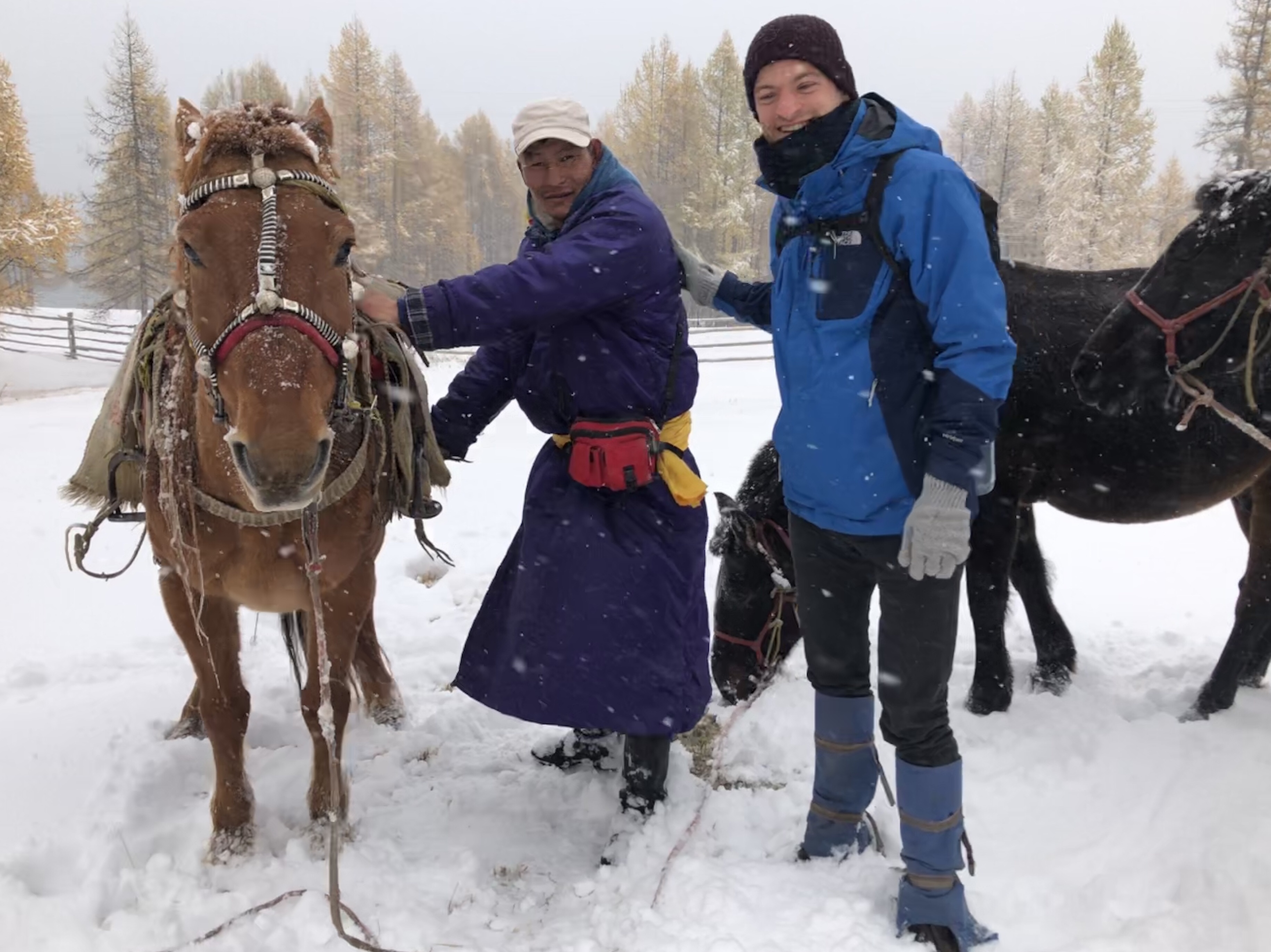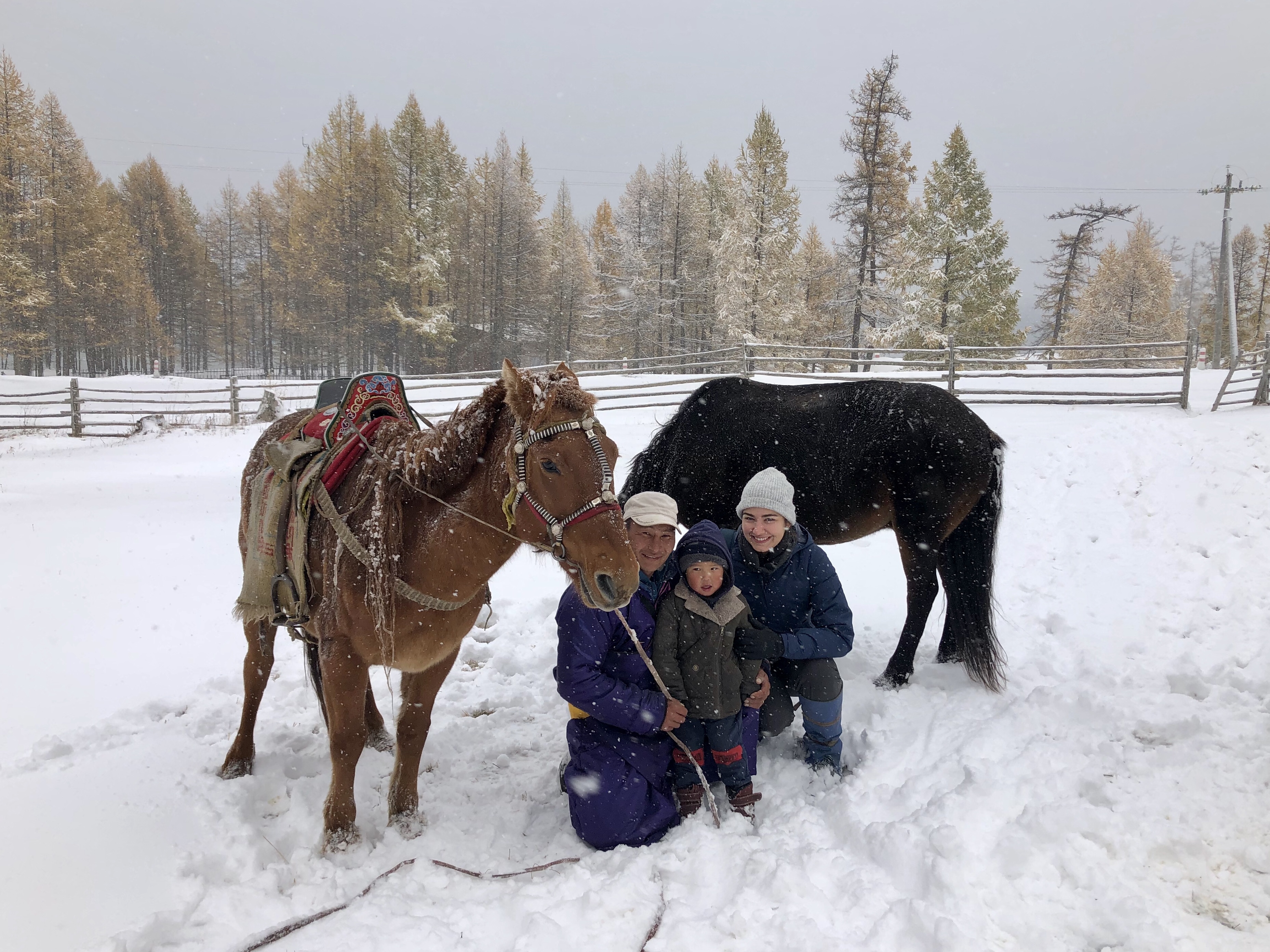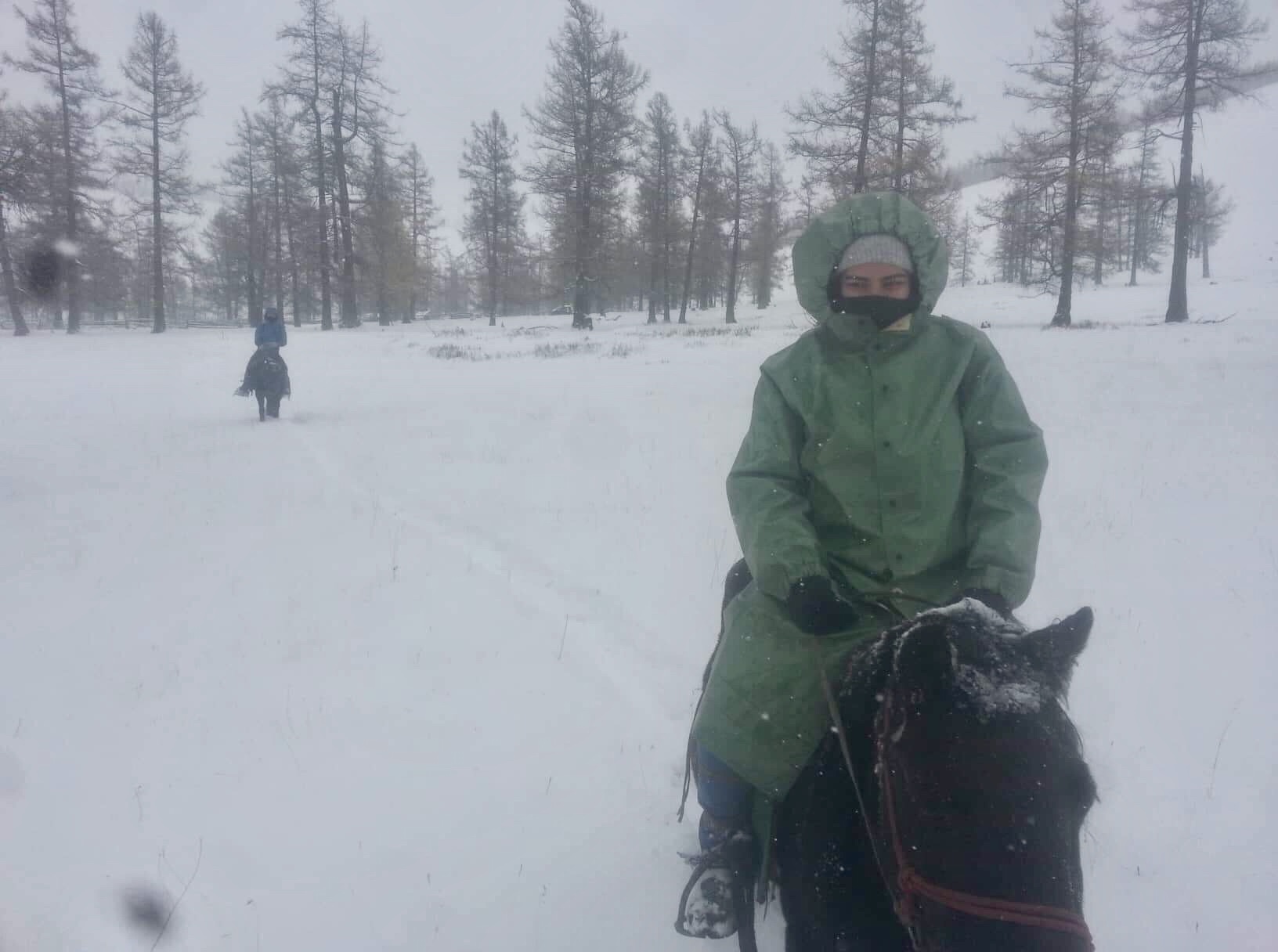 À cette chaleur intérieure s’oppose dès le lundi un froid très sec environnant. À cheval, je sens mes extrémités endolories, mes joues engourdies, je devine mon nez rougi. Borjee, le guide, me recouvre le mercredi d’un immense manteau imperméable qui paralyse tous mes mouvements mais rend mon corps insensible aux flocons qui le recouvrent. Il semble très soucieux de mon confort et décide de tenir mon cheval par une corde, le dirigeant lui-même, afin de pouvoir tirer l’animal s’il glisse et pour me laisser me concentrer sur mes mains et mes orteils gelés… Toute la journée, je suis donc simplement assise sur ma selle sans n’avoir rien à guider : si l’intention est attentionnée, j’hésite entre me considérer comme une princesse, un enfant ou une captive ramenée au bercail…