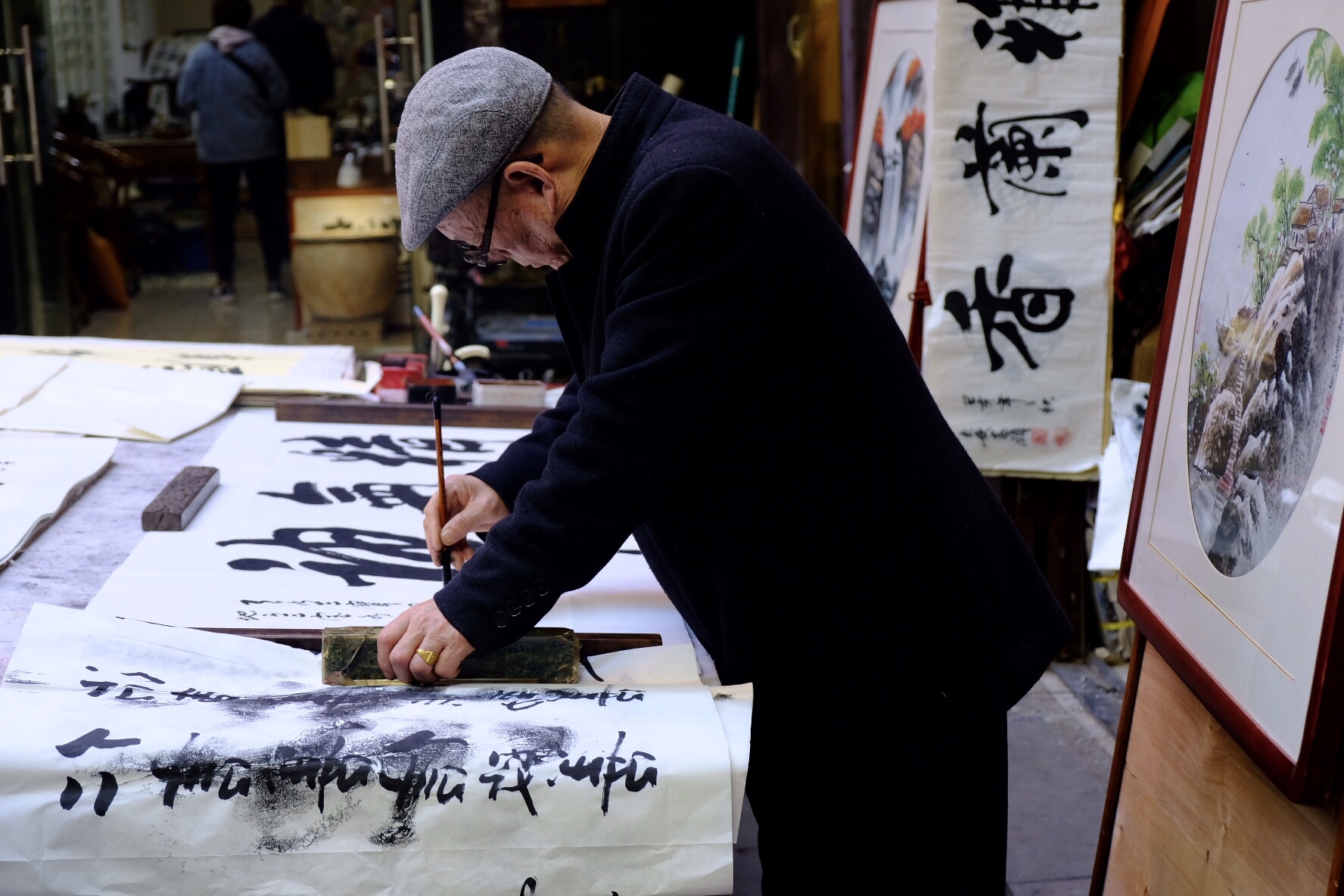 Pourtant, au milieu de cette orchestration mécanique globale, le pays conserve une âme singulière, poétique, propre à elle-même mais ambiguë. Entre les façades des temples rénovés aux couleurs criardes se trouvent des faits et gestes d’une douceur inattendue, toujours embaumés par le parfum de l’encens ; aux pieds des immeubles impersonnels, dans les parcs, au détour de n’importe quelle rue, les femmes se réunissent et dansent ensemble ; près des marchés, au fond des restaurants, derrière les fenêtres, on joue au majong ou aux cartes, en buvant toujours du thé ; les étales débordent de couleurs et les saveurs méconnues sont attirantes, puis l’on trouve à côté des fruits et légumes exotiques des pattes de poulet, têtes de canard, intestins ; des centres villes sont détruits pour être reconstruits dans une esthétique historique flambant neuve, mais les arbres sont soutenus et protégés ; malgré une maîtrise de l’anglais absolument inexistante, chacun sourit, souhaite nous aider, tend son téléphone avec un traducteur aux aguets ; opposée à la vitesse des transports ou la technologie des échanges, la lenteur sereine des anciens rassure ; le matin de bonne heure, le silence règne et guide les séances de qi cong, même si le bruit déroutant des raclements de gorge, nez, bronches n’est jamais bien loin…