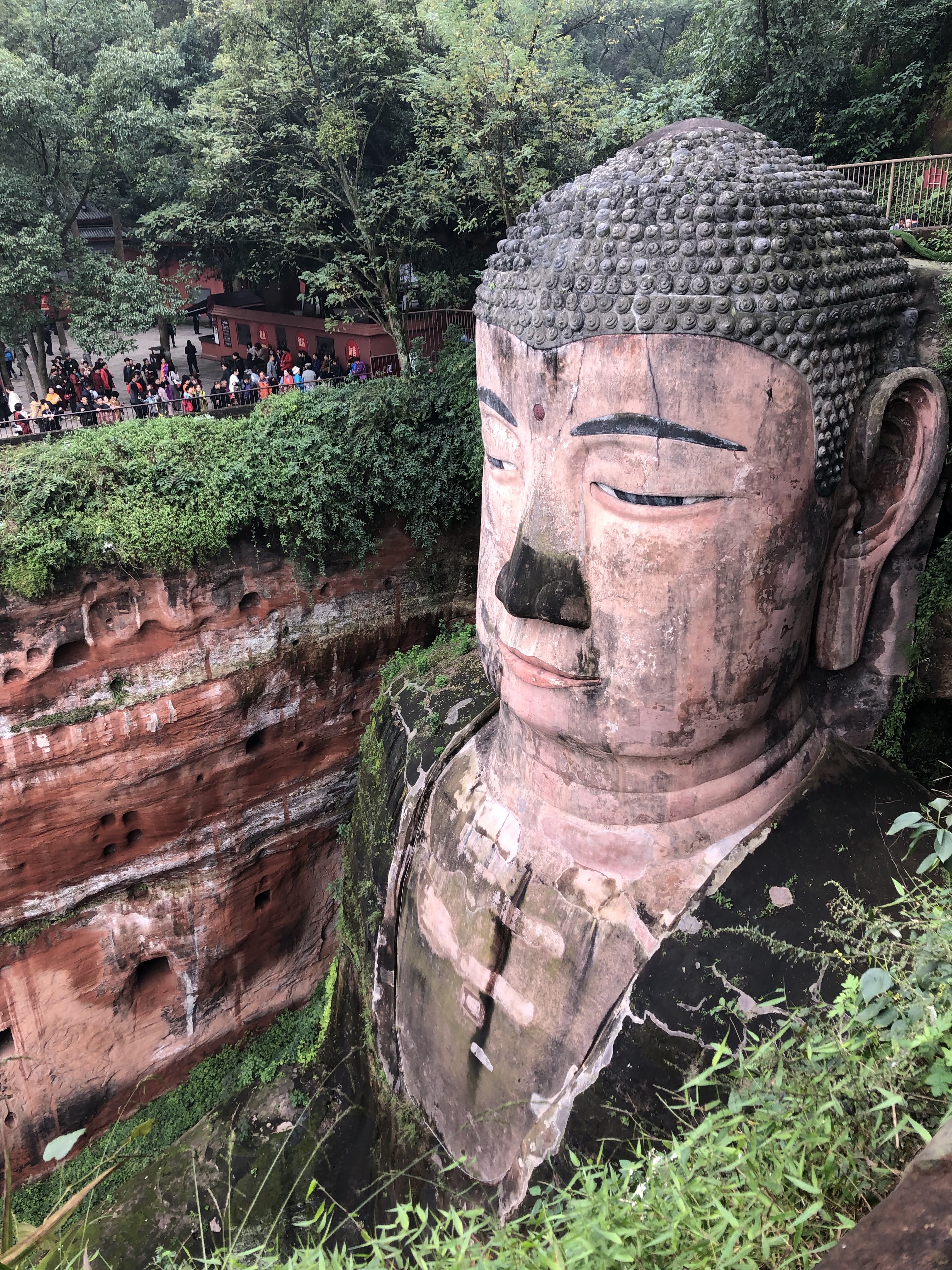 Le lendemain matin cependant, je pars en excursion pour Leshan puis le mont Emei, prête à rencontrer un très grand bonhomme et de nombreuses marches. Jay, un anglais de mon auberge ayant le même programme, et Franck et Chris, britannique et américain venus enseigner l’anglais en Chine pour un an et rencontrés à la sortie de la gare, sont mes compagnons. Nous prenons le bus ensemble et arrivons à l’entrée du site inscrit au patrimoine mondial de l’UNESCO, gorgé de touristes. Au fil des marches que nous montons, des statues sculptées dans la roche se révèlent, au milieu des feuillages. Une dizaine de minutes plus tard et le voilà : l’immense visage d’un bouddha de 71 mètres de haut et âgé de 1300 ans apparaît. Le Grand Bouddha de Leshan est assis paisiblement, mains sur les genoux, le regard fixé sur un fleuve embrumé et une ville polluée. Un infime sourire semble d’abord dessinait ses traits mais, alors que je m’approche de lui, son expression diffère et se teinte d’un air désolé… Le plus grand Bouddha sculpté du monde a-t-il toujours eu ces yeux un peu mélancoliques et cette moue attristée ? Ou son visage s’est-il transformé en même temps que le paysage alentour s’industrialisait ? Alors que les bateaux de touristes défilent à la queue leu leu pour le photographier et que les tours de béton sur la rive opposée transpercent la brume, je tente d’imaginer ce qui pouvait lui faire face au VIIIe siècle, quand il apparaissait dans la roche. Je me sens bien petite, à ses pieds plus hauts que moi…