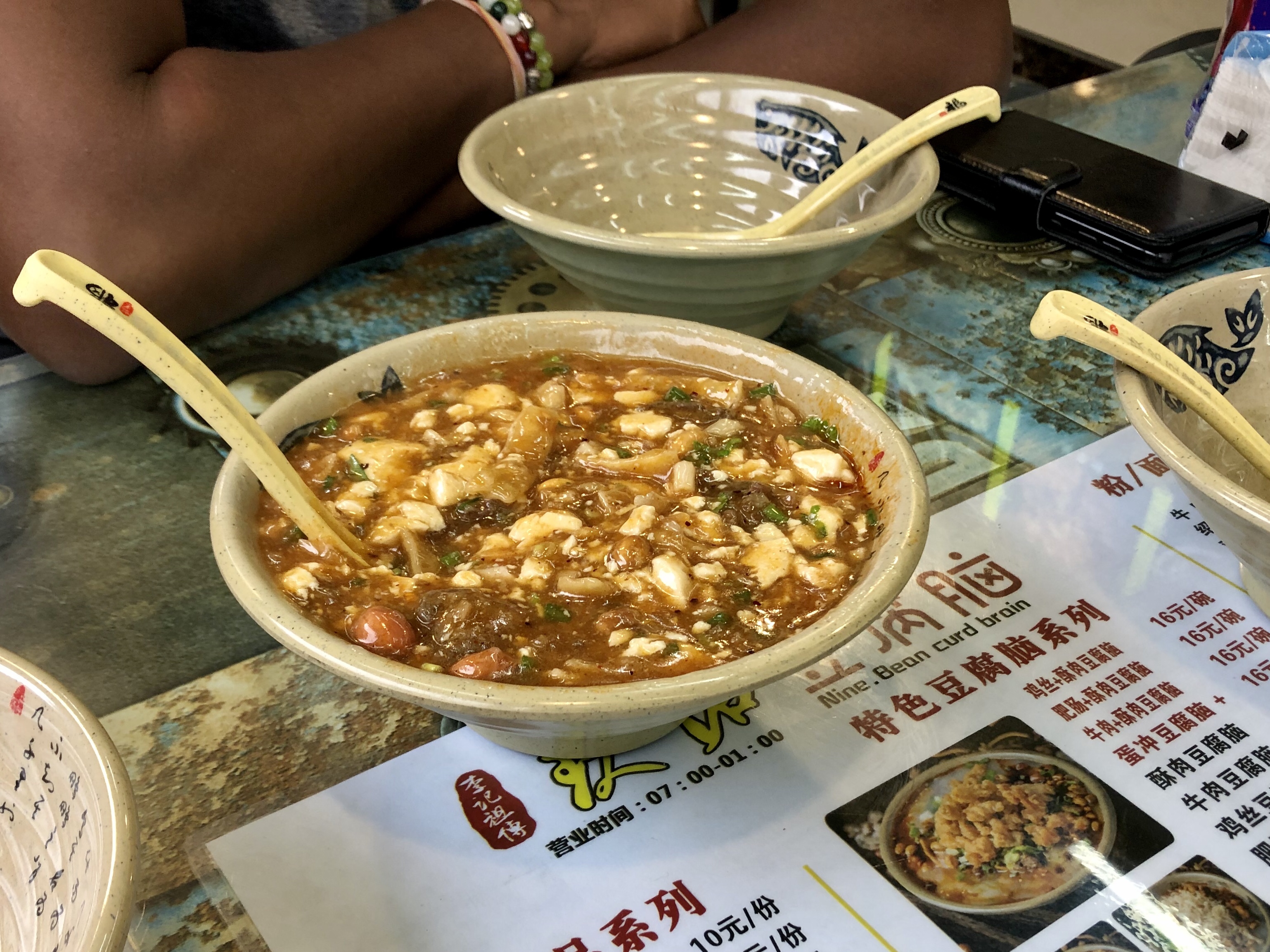 Nous partons ensuite déjeuner dans le centre de Leshan, dans une rue où les restaurants sont par dizaines et où aucun mot d’anglais n’apparaît. Nous nous laissons guider par Chris, qui vit a Chengdu depuis près d’un an et connaît bien les spécialités du Sichuan. Il commande des plats dont l’image n’a rien d’appétissant mais qui se révèlent pleins de saveurs et de textures originales : à côté de nouilles et de petits sandwichs au porc ou au bœuf, cacahuètes, tofu, légumes se mélangent dans une sorte de grosse poupoute dont je ne me souviens plus le nom, mais qui est une agréable surprise. J’essaie de ne pas prêter attention au feu que les épices éveillent dans ma bouche et de savourer au mieux… Le Sichuan est connu pour sa cuisine et pour son poivre, bien particulier : dans mon cas, il ne brûle pas seulement les lèvres mais bien l’intérieur du corps, de la gorge au nez et même aux oreilles. Mes repas ne sont pas toujours de tout repos, mais l’espèce de flubber translucide que nous mangeons en dessert apaise mon supplice et, si la texture est très étrange, le goût sucré n’est pas désagréable. Il est plus de quinze heures quand nous finissons de déjeuner, et nous partons enfin pour Emeishan.