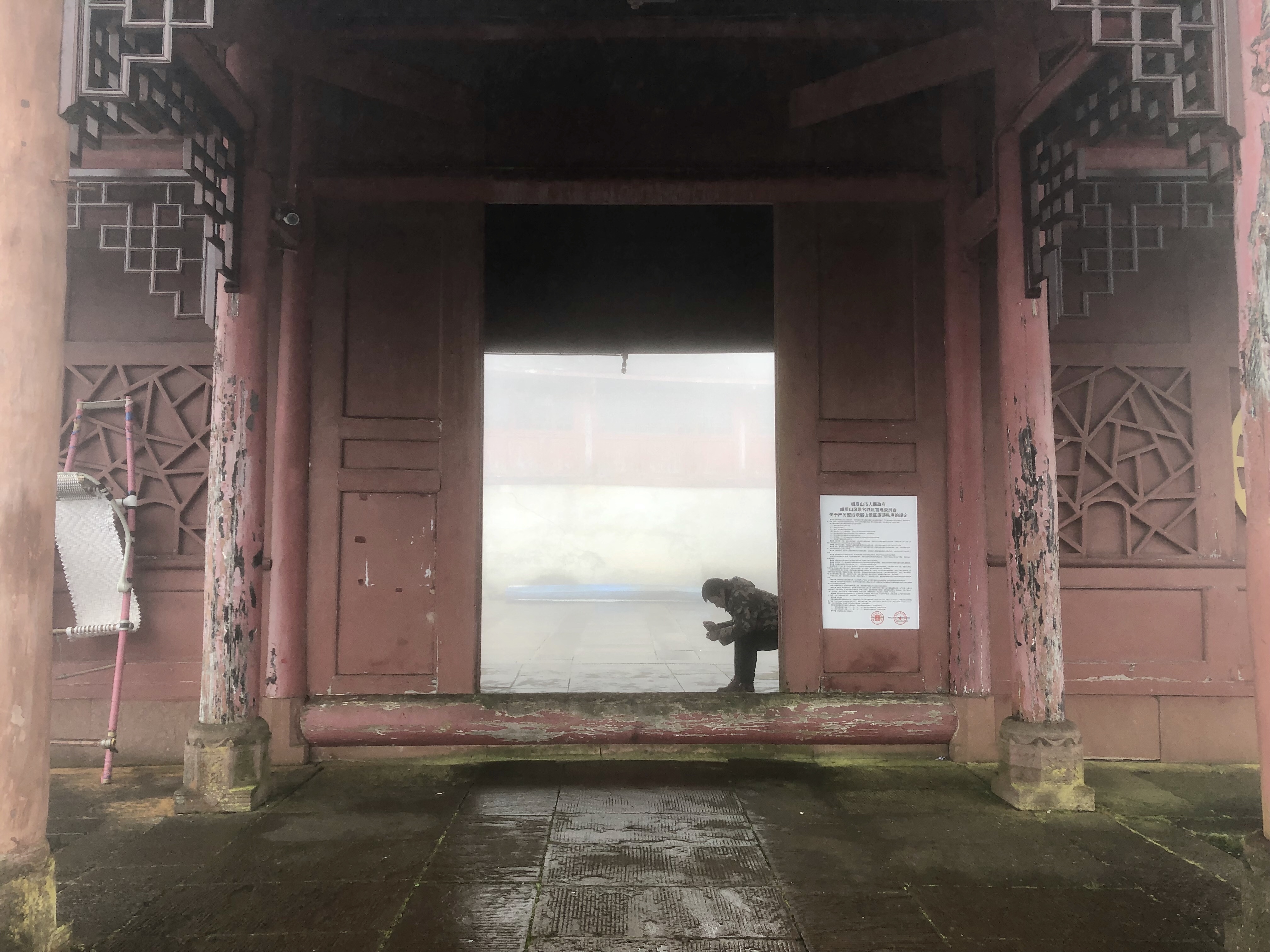 Le paysage réputé extraordinaire du mont Emei reste un mystère pour moi : la météo n’évolue pas de la descente, et je reste plongée dans une atmosphère nébuleuse tout le week-end. À défaut de me perdre dans l’immensité des panoramas, je m’attarde donc sur les arbres, les troncs qui ne se noient pas dans le brouillard, les personnes que je croise. Le défilé est varié : au sommet, des groupes entiers descendent du funiculaire en tenue de randonnée extrême alors que je croise le lendemain des femmes faire l’ascension en jupe et bottes à talons ; aux pieds de l’immense statue recouverte d’or, à côté des inconditionnels du selfie, un groupe de pèlerins acheve une procession éprouvante, s’agenouillant et se relevant tous les trois pas ; sur le chemin, au milieu des 60 000 marches, des locaux portent des barres métalliques longues de plusieurs mètres, des panneaux pour quelque construction en cours, des paniers remplis de provision, tandis qu’au sommet toujours, des jeunes gens paient les services de porteurs de chaises à la sortie du bus. Comme partout ailleurs en Chine, les paradoxes sont surprenants.