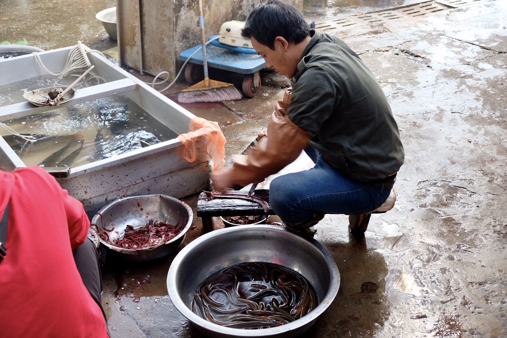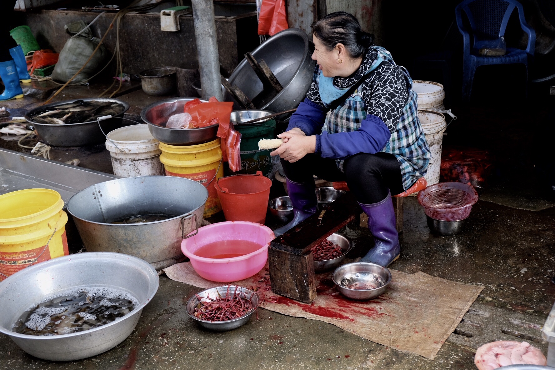 Après cette visite, alors que j’erre de rue en rue et pense prendre un raccourci vers l’auberge, je me retrouve au milieu d’un marché alimentaire local. L’occasion de m’imprégner une dernière fois de cette culture si singulière. Un de mes compagnons de petit déjeuner m’avait justement raconté être tombé par hasard sur un marché bien surprenant : « vous le reconnaîtrez à l’odeur », m’avait-il dit. Indice infaillible. L’air ambiant me retourne l’estomac, mais c’est un véritable théâtre, une arène dans laquelle mes yeux ne savent plus où se poser. Les poules, les lapins, les coqs, les crustacés vivants se côtoient, tandis que les pattes de poulets, les poissons, les canards, les pièces de viande de toutes tailles et de toutes formes s’entassent de toutes parts. Hommes et femmes s’attellent, au couteau ou à mains nues, à préparer ces chairs. Un chien grillé est étalé les quatre pattes en l’air, éventré, un autre est couché sur le côté, une tortue sans carapace est seule dans une bassine, du sang coule dans chaque allée. J’ose m’arrêter, regarder, mémoriser. On me sourit. Quelques allées encore et je retrouve finalement des amoncellements de légumes, de condiments, d’épices, de préparations pimentées…
