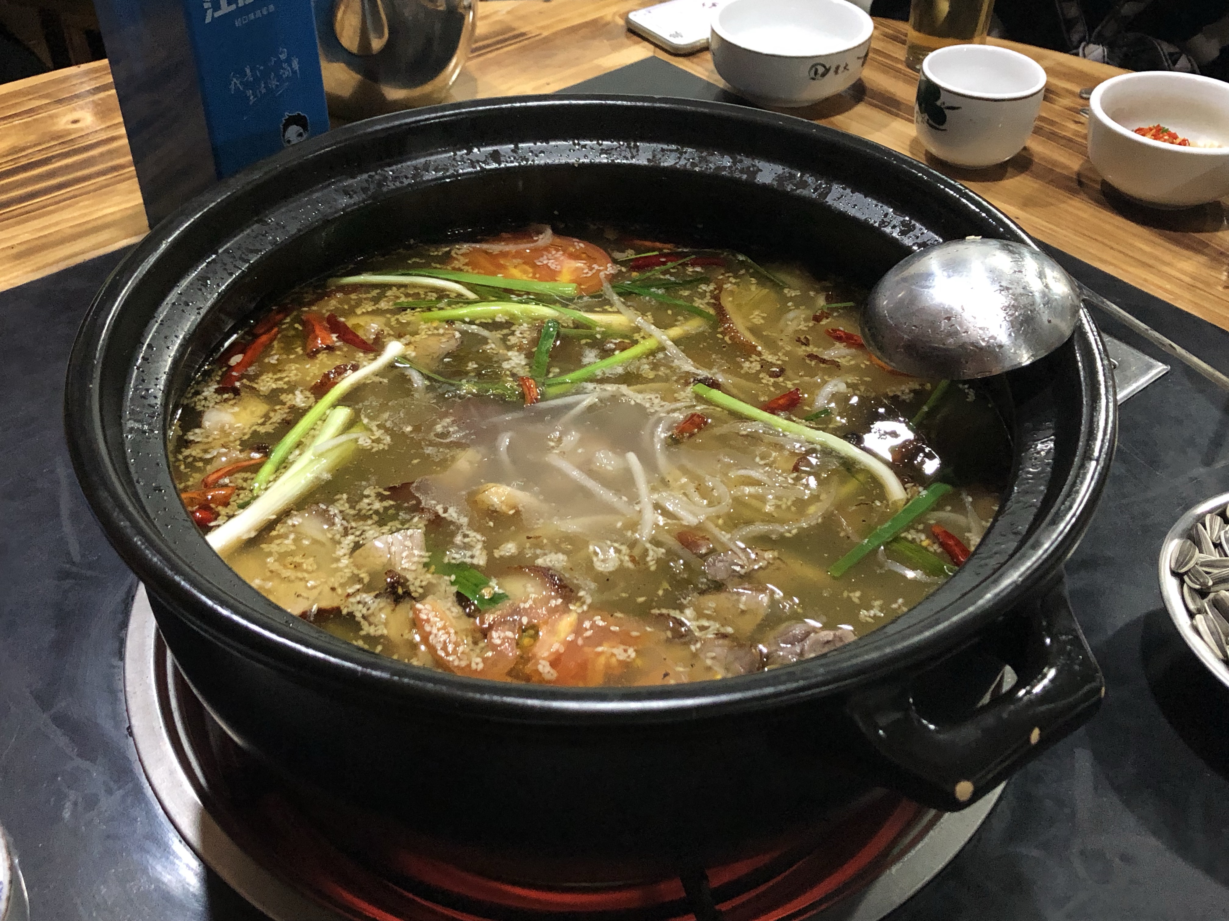 S’il est bien étrange de me trouver dans un tel environnement au milieu de mon voyage, je me laisse guider dans les hauteurs de la région avec plaisir. Le Yunnan compte un grand nombre de minorités ethniques, et, après cette matinée studieuse, nous allons déjeuner dans un restaurant typique de l’une d’elles. Sur une table ronde et basse, recouverte de feuilles de bananier et de salade verte en guise d’assiettes, les plats arrivent, les saveurs se multiplient. Avec un gant en plastique pour seul couvert, je déguste cette cuisine que je ne connais pas : viandes et poissons cuits de multiples façons, riz gluant teinté d’une couleur violette, galettes, fruits… et toujours cette eau chaude d’une couleur ambrée, où quelques graines ont infusé. Au moment où j’écris, les saveurs ont disparu de mon palais qui se souvient pourtant bien avoir été à nouveau mis à rude épreuve, mais le souvenir de mon enthousiasme autour de cette table demeure. Les autres repas dans cette ville seront tout autant riches de goûts nouveaux et délicieux : un « hot pot » (bouillon dans lequel on fait cuire les aliments que l’on souhaite), du poulet noir, quelques abats, du poisson grillé… Guidée par des locaux, il est plus facile d’être agréablement surprise…
